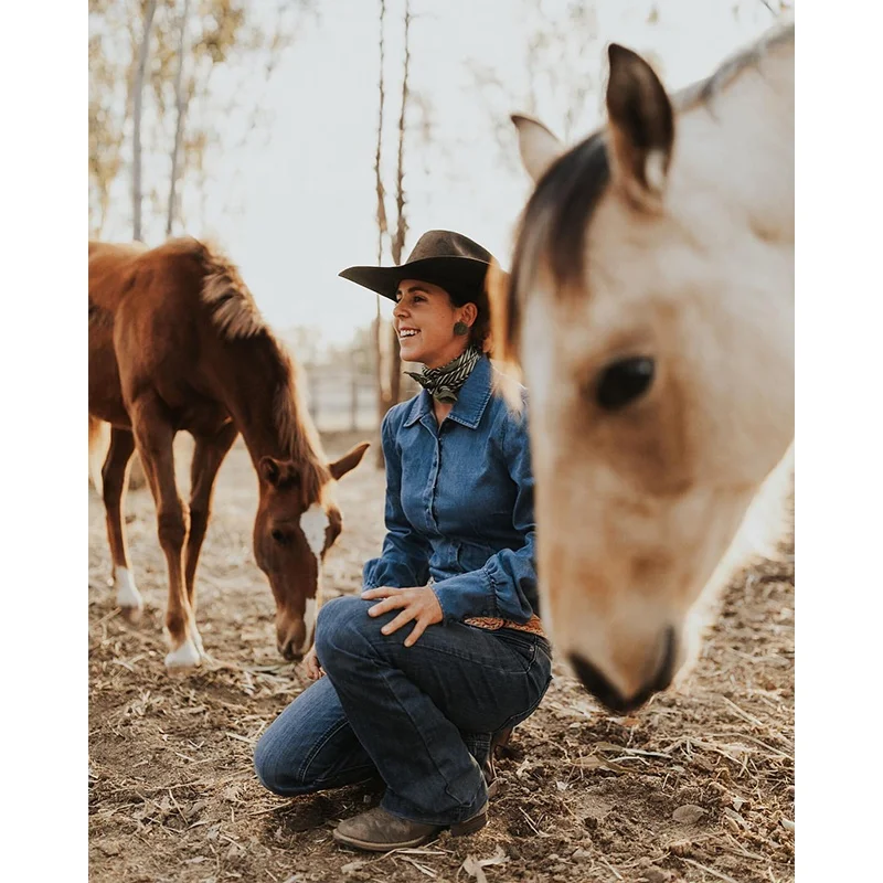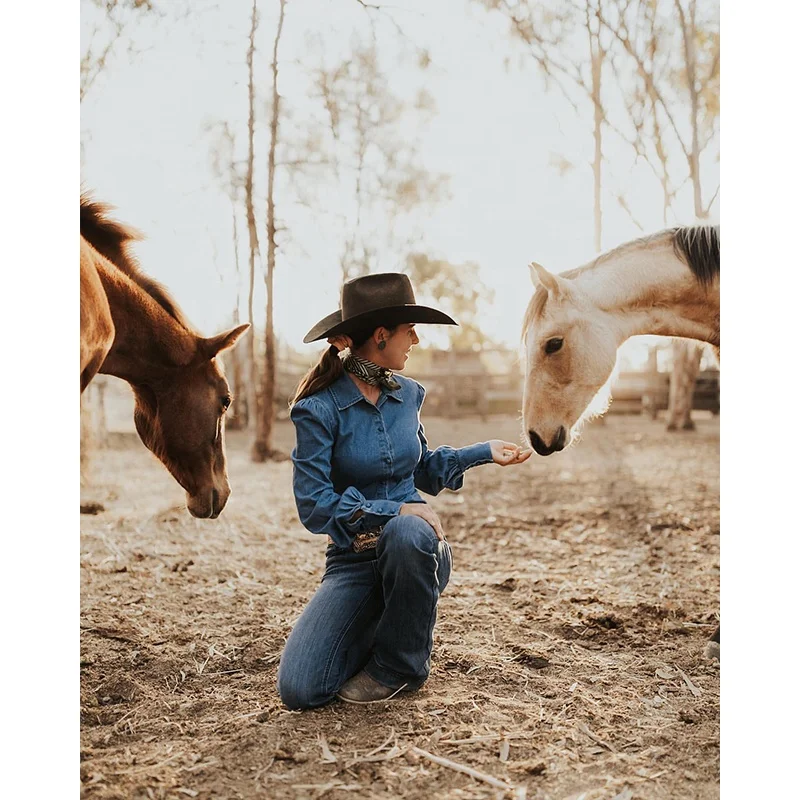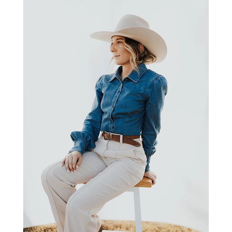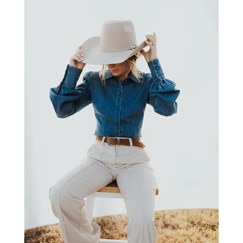 high quality Ladies cotton denim work shirt long sleeve full Button Australian women 100%cotton denim blue Western arena blouse